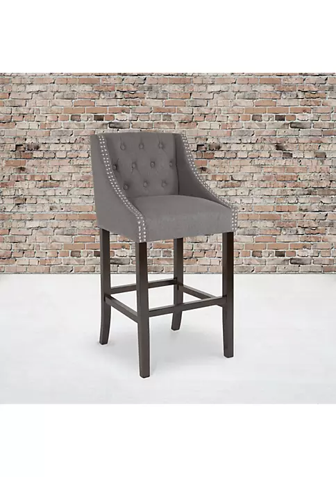 This classically sophisticated upholstered barstool with decorative nail trimming lend a touch of old world elegance and comfort. You are immediately drawn to the button tufting on the back and double nail trimming along the arms. A dark walnut frame contrasts the upholstery, while offering a proper resting place for your feet.