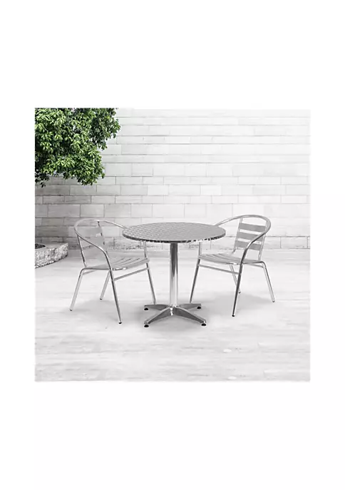 - Round Patio Table for Restaurants | Seating for 3 people | Smooth Stainless Steel Table Top | Aluminum Column and Base | Base Size: 23.5″W | Plastic Floor Glides protect floor while indoors