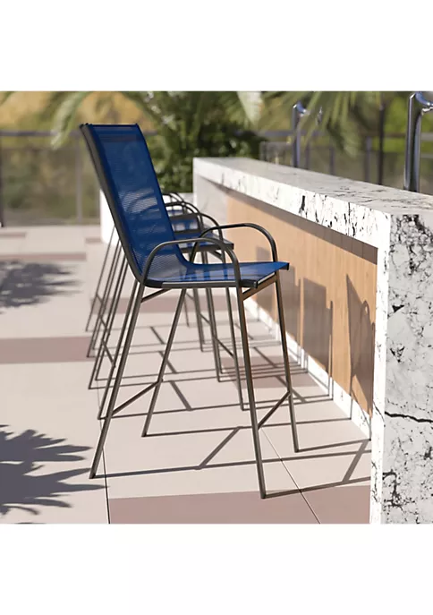 - Set of 4 Sling Patio Chairs for Restaurant and Residential Outdoor Spaces | Metal Stack Chairs – Stack Quantity: 4 | Breathable Brown Textilene Fabric Upholstery | Integrated Curved Arms provide support to upper body | Black Powder Coated Frame Finish | Plastic Floor Glides protect floors when used indoors