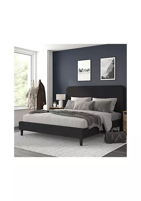 - King Size Upholstered Platform Bed – No Box Spring Required | Charcoal Black Fabric Upholstered Headboard | Iron and Steel Support Braces with Wood Screw Reinforcements Holds up to 500 Lbs. Static Weight | 14 Wooden Support Slats Accommodate Almost Any Mattress without a Box Spring | Fixed Plastic Floor Glides | Remove Dust or Soil with a Damp Cloth