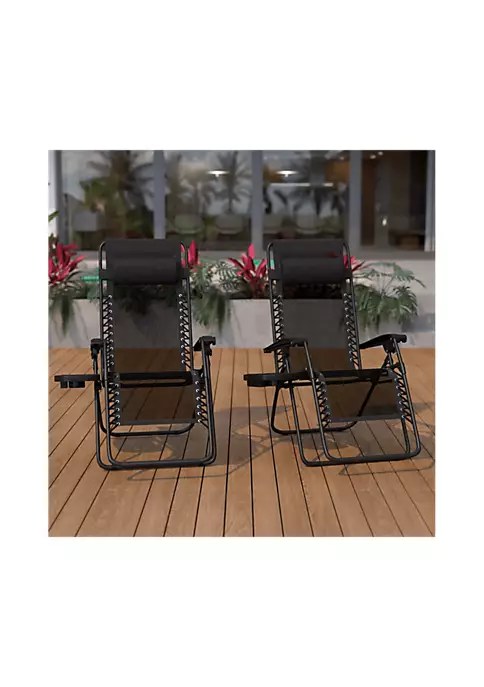 - Set of 2 Portable Folding Zero Gravity Lounge Chairs | Mesh Back and Seat allows airflow to keep you cool | Adjustable Headrest Pillow moves up and down for your comfort | Push Back Recline – knob tightens your favorite position | Drink and cell/tablet holder attaches on either side | Easily cleaned with a water based cleaner