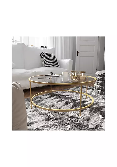 - Modern Style Coffee Table for use in multiple environments | 6mm Clear Tempered Glass Surface strong enough for daily use | Round Top and Base pairs with most furniture | Brushed Gold Finish lends a luxurious feel | Steel Powder Coated Frame for long-lasting use | Floor Glides protect hard flooring surfaces