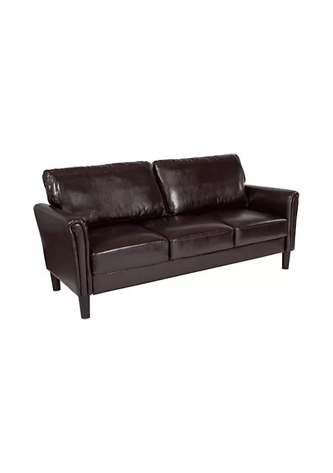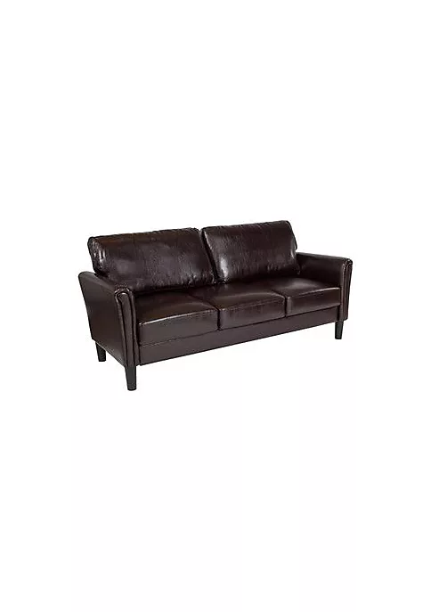- Contemporary Style Brown LeatherSoft Sofa | Mid-Back Design for extra support | Tailored Arms relieve pressure from the neck and shoulders | Loose Back Cushions | Hook and loop system keeps back cushions uniform | Generously Padded with CAL 117 Fire Retardant Foam
