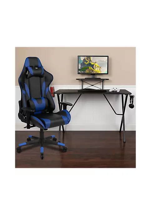 - Gaming Desk and Chair Bundle | Desk: 51.5″W x 23.75″D x 37.25″H; Raised Monitor Platform: 22″W x 7″D x 7.25″H; Removable for Dual Monitors | Smooth .75″ Thick Black Laminate Top with Cable Management Grommet | Detachable Cup Holder (3.5″W x 2.75″H) and Headset Hook (3.5″W x 3.75″D) | Black Powder Coated Frame Finish with Screw Leveling Floor Glides | High Back Gaming Chair with Height Adjustable Pivot Arms: 29″W x 29-46″D x 48-51″H