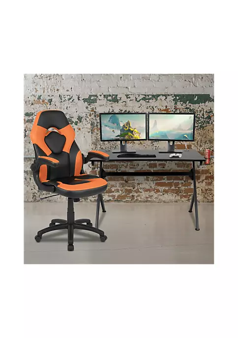 - Gaming Desk and Chair Bundle | Desk: 45.25″W x 28.875″D x 30.25″H | Carbon Fiber Top preserves structural integrity to extend the lifetime of the desktop | Detachable Cup Holder (3.5″W x 3.5″H) and Headset Hook (3.25″W x 2.25″D) | Black Powder Coated Frame Finish with Self Leveling Floor Glides | High Back Gaming Chair with Flip-Up Arms: 24.75″W x 26.25″D x 42.25-46.25″H