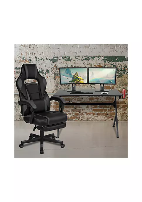 - Gaming Desk and Chair Bundle | Desk: 45.25″W x 28.875″D x 30.25″H | Carbon Fiber Top preserves structural integrity to extend the lifetime of the desktop | Detachable Cup Holder (3.5″W x 3.5″H) and Headset Hook (3.25″W x 2.25″D) | Black Powder Coated Frame Finish with Self Leveling Floor Glides | High Back Gaming Chair with Reclining Curved Arms: 28″W x 29.25-68″D x 48-51.25″H