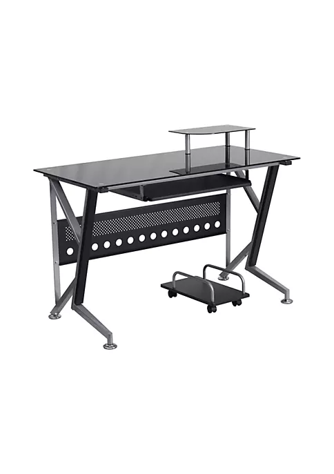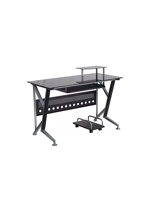 - Contemporary Style Computer Desk | Black Tempered Glass Surface | 8mm Thick Glass | Spacious Rectangular Desktop | Monitor Platform: 15.75″W X 9.75″D X 4.5″H From Surface; Weight Capacity: 44 Lbs. | Sliding Keyboard Tray: 23.5″W X 11.75″D X 26.5″H From Floor