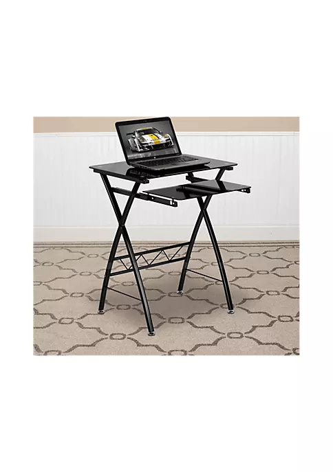 - Contemporary Style Computer Desk | Black Tempered Glass Surface | 6mm Thick Glass | Sliding Keyboard Tray: 17.25″W x 11″D x 5mm Thick Glass | Crisscross Leg Design | Black Powder Coated Frame Finish
