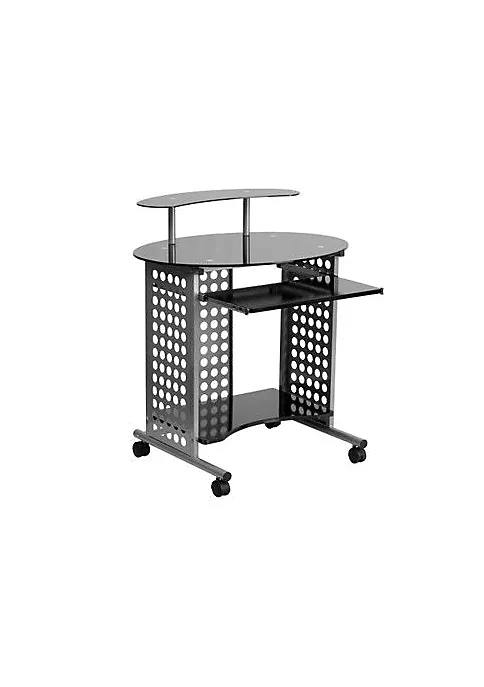 - Contemporary Style Computer Table | Black Tempered Glass Surface | 8mm Thick Glass | Desktop: 31.25″W X 23.5″D | Monitor Platform: 25.75″W X 7.875″D X 5mm Thick Glass; Weight Capacity: 33 Lbs. | Sliding Keyboard Tray: 21.125″W X 11″D