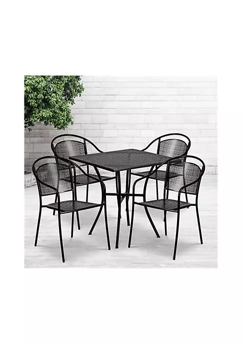 - Stackable Patio Chair | Stack Quantity: 8 | Curved Round Back Design | Integrated Arms | Rain Flower Back and Seat Design | Black Powder Coat Finish