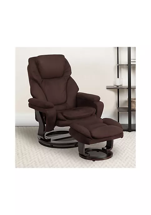 - Modern Style Recliner and Ottoman Set | Brown Microfiber Upholstery | Plush Arms | Ball-Bearing Swiveling Mahogany Base | Lever Recliner | Wall Clearance: 7″