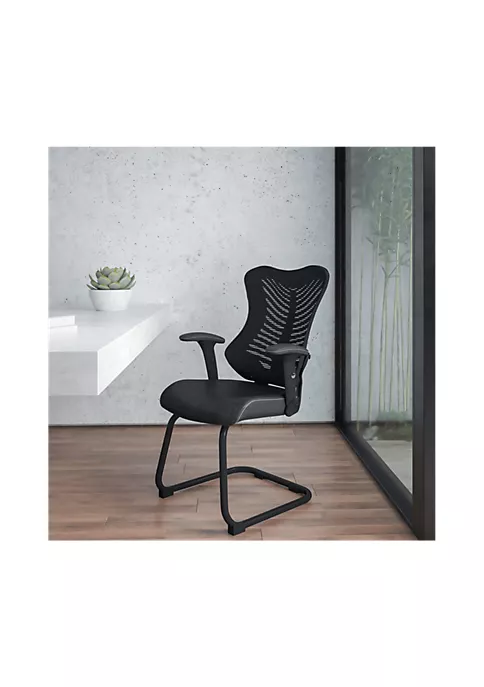 - Contemporary Guest Office Chair | Padded Height Adjustable Arms | Ventilated Mesh Back | Built-In Lumbar Support | Back Width: 16.25-19.25″ | White Stitch Accent on Seat and Arms