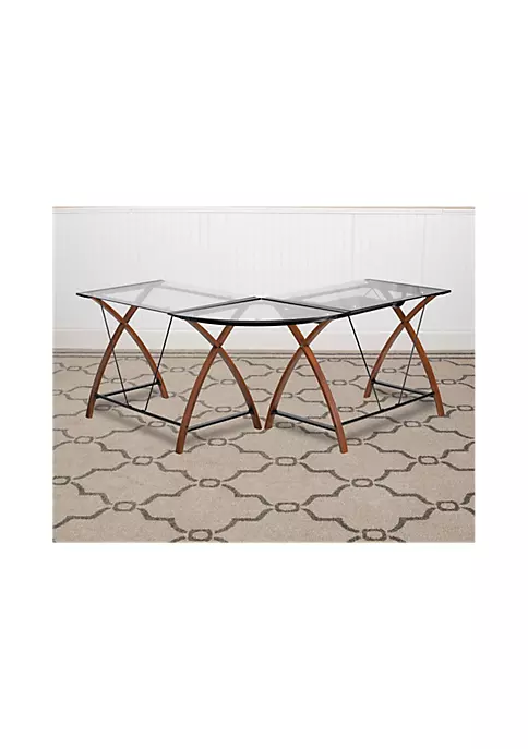 - Contemporary Style L-Shaped Home Office Desk | 5mm Thick Clear Tempered Glass Surface strong enough for everyday use | Black Sliding Keyboard Tray: 23.5″W x 11.75″D x 25.75″H from Floor | Crisscross Cherry Finished Leg Design lend a stylish look to any d | Black Powder Coated Brace Frame Finish provides a stable work surface | Floor Glides prevent damage to hard flooring surfaces