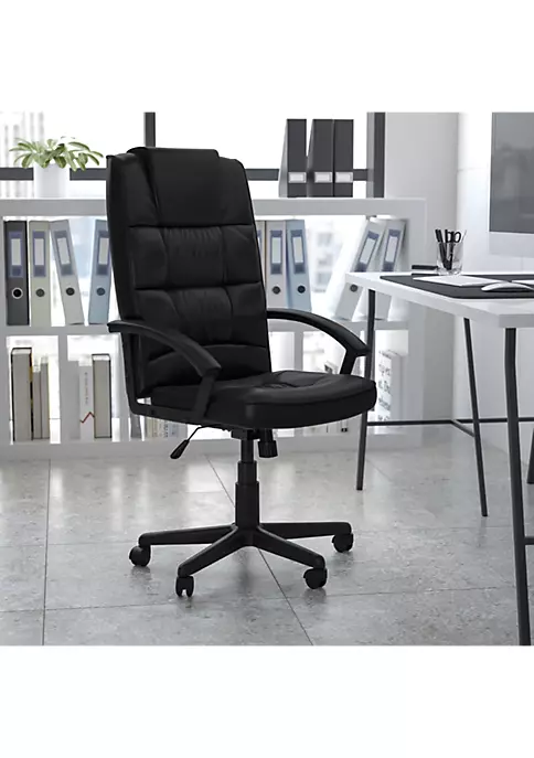 - Contemporary Office Chair | Black LeatherSoft Upholstery | High Back Design with Headrest | Tilt Lock Mechanism rocks/tilts the chair and locks in an upright position | Tilt Tension Adjustment Knob adjusts the chair’s backward tilt resistance | CAL 117 Fire Retardant Foam