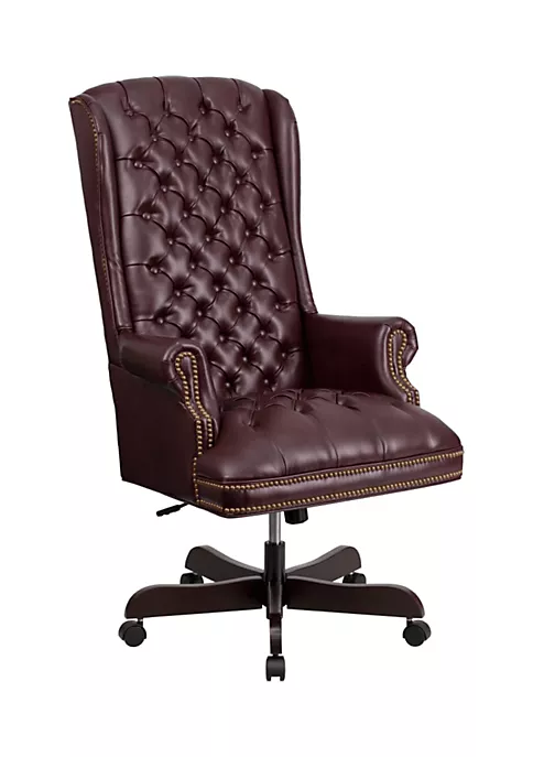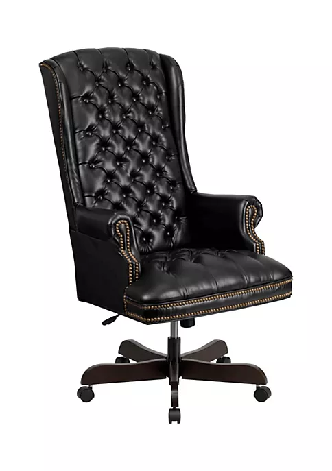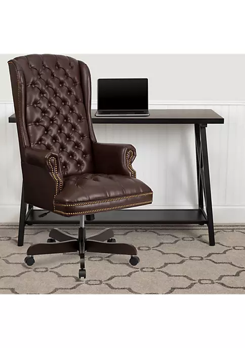 - Traditional Office Chair | Brown LeatherSoft Upholstery | High Back Design | Button Tufted Back and Seat | Individual Brass Nail Accents | Tilt Lock Mechanism rocks/tilts the chair and locks in an upright position