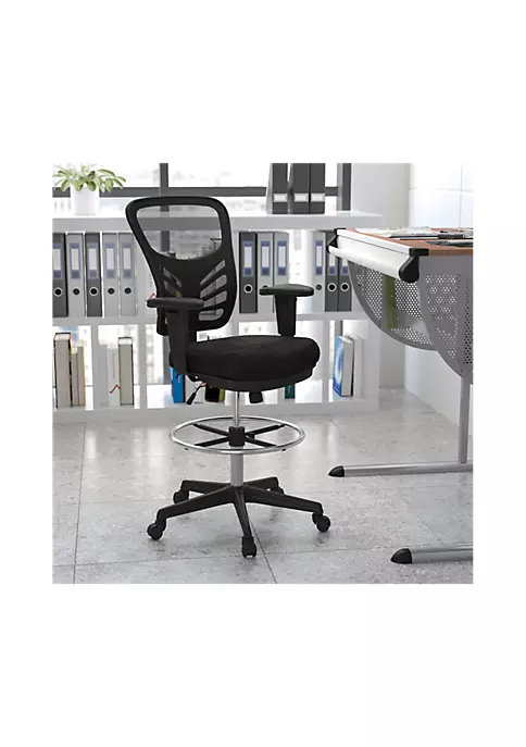 - Contemporary Drafting Stool with Height Adjustable Padded Arms | Mid-Back Design with breathable mesh material | Curved back with lumbar support | Tilt Lock Mechanism rocks/tilts the chair and locks in an upright position | Tilt Tension Adjustment Knob adjusts the chair’s backward tilt resistance | Contoured Black Mesh Upholstered Seat with CAL 117 Fire Retardant Foam
