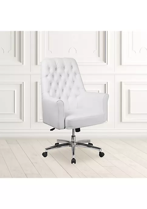 - Traditional Office Chair | White LeatherSoft Upholstery | LeatherSoft is leather and polyurethane for added Softness and Durability | Button Tufted Back | Tilt Lock Mechanism rocks/tilts the chair and locks in an upright position | Padded Seat with CAL 117 Fire Retardant Foam