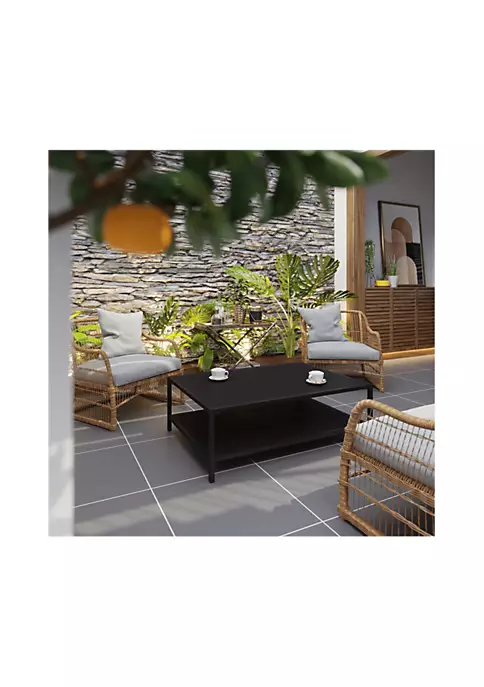 - Contemporary 2 Tier Black Metal Coffee Table for indoor or outdoor use | Weather Resistant Textured Steel Top for an up-market look | Lower Storage Shelf for extra display space or throw blankets | Height Between Shelves: 10.25″H | 18 Gauge Welded Steel Construction with Bolted Connectors | Accommodates up to 300 lbs. Static Weight Capacity