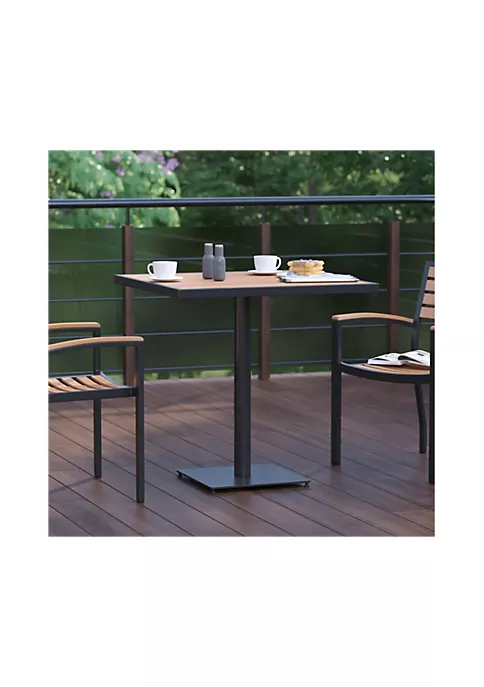 - Outdoor Patio Dining Table with dining for 4 | Poly slat top made of strong synthetic teak | Easily cleaned with a water based cleaner | Weather and rust resistant for durability | 150 lb. Weight Capacity | Black Powder Coated Steel Frame with Protective Adjustable Floor Glides