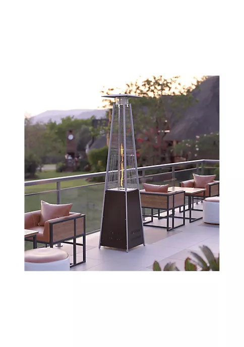 Add time to your outdoor calendar for dining or lounging at your home or business when you purchase one or more of this 42,000 BTU pyramid shaped outdoor patio heater. The improved appearance of today’s outside heaters will complement your outdoor furnishings and will lend a wow factor to open air commercial events. This bronze propane patio heater has a 3 6 foot heat radius that quickly chases away the chill from dropping temperatures and the attached wheels allow it to be easily moved from place to place as needed. Made from premium stainless steel, and boasting metal screw construction, this outdoor heater is built to last and will be a welcomed addition to your outdoor living areas. A 20 lb. LP propane cylinder fits snugly in the tank housing and will provide hours of warmth for your guests. All assembly tools, including a phillips screwdriver and open ended wrench, are included so you can have your new radiant heating appliance put together in less than 60 minutes. Pair this contemporary outdoor heater with our set of 4 all weather poly resin wood adirondack chairs for a complete setup.