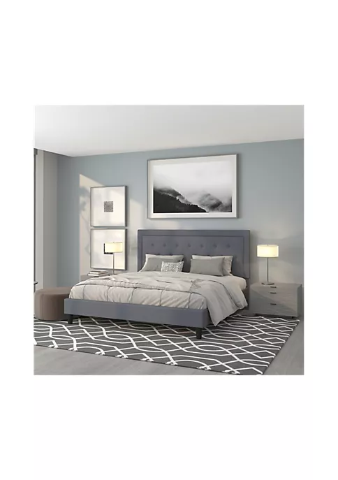 - Platform Bed | Panel Headboard | Light Gray Fabric Upholstery | Button Tufted | 15 Wood Support Slats | Center Support Metal Leg