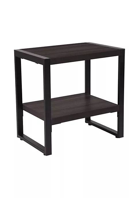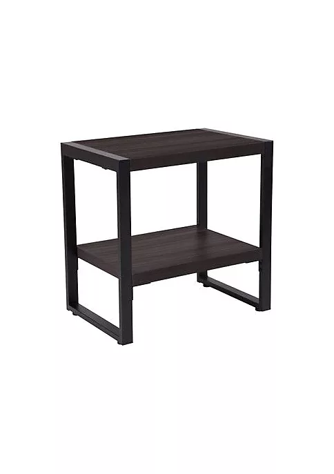 - Contemporary Style | Charcoal Wood Grain Laminate Finish | 1.5″ Thick Rectangle Top | Height Between Shelves: 12.75″H | Black Powder Coated Frame Finish | Adjustable Floor Glides