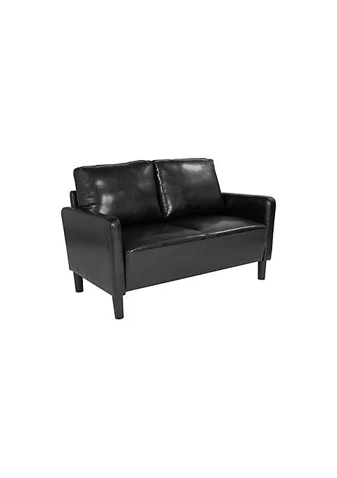 - Contemporary Style Black LeatherSoft Loveseat | Mid-Back Design for extra support | Track Arms relieve pressure from the neck and shoulders | Loose Back Cushions | Hook and loop system keeps back cushions uniform | Generously Padded with CAL 117 Fire Retardant Foam