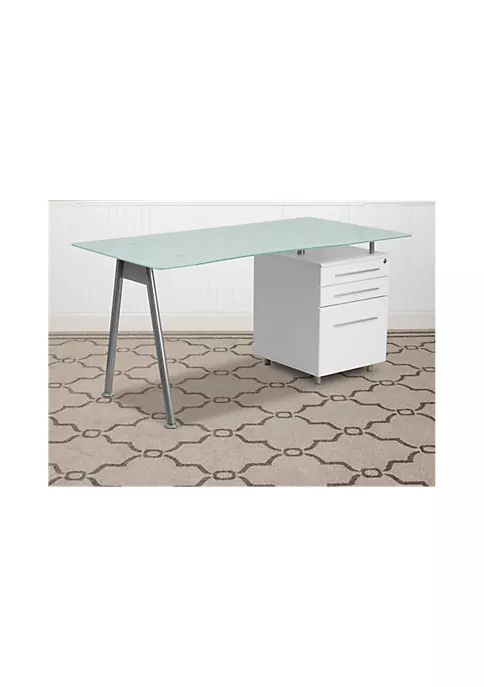 - Contemporary Style Computer Desk | Frosted Tempered Glass Surface | 7mm Thick Glass | Spacious Beveled Rectangular Desktop | White Box/Box/File Pedestal with Silver Bar Pulls | Includes lock and key to lock all drawers simultaneously