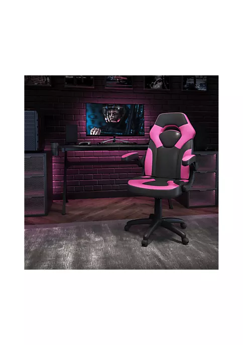 - Contemporary Swivel Video Game Chair | Black LeatherSoft Upholstery with Pink mesh inserts | High Back Design with lumbar support | Padded Flip-Up Arms | Tilt Lock Mechanism rocks/tilts the chair and locks in an upright position | Tilt Tension Adjustment Knob adjusts the chair’s backward tilt resistance